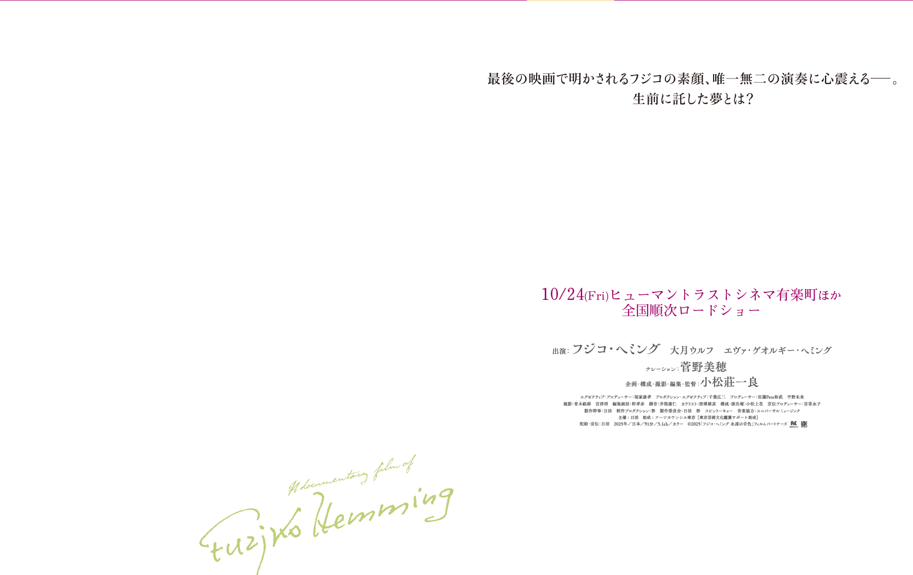 2024年4月21日に92歳で旅立ったフジコ・ヘミング。情感あふれるダイナミックな演奏は、音楽ファン以外でも国内外多くの人の心をとらえ、“魂のピアニスト”と呼ばれていた。その唯一無二の演奏を再び聴きたい、聴いてみたかったという熱い声が高まっている。本作では、圧巻の“ラ・カンパネラ”、名曲クラシックの数々、現代作曲家のオリジナル曲など初公開を含むフジコの演奏を映画館のスクリーンで最大限に体感できる。