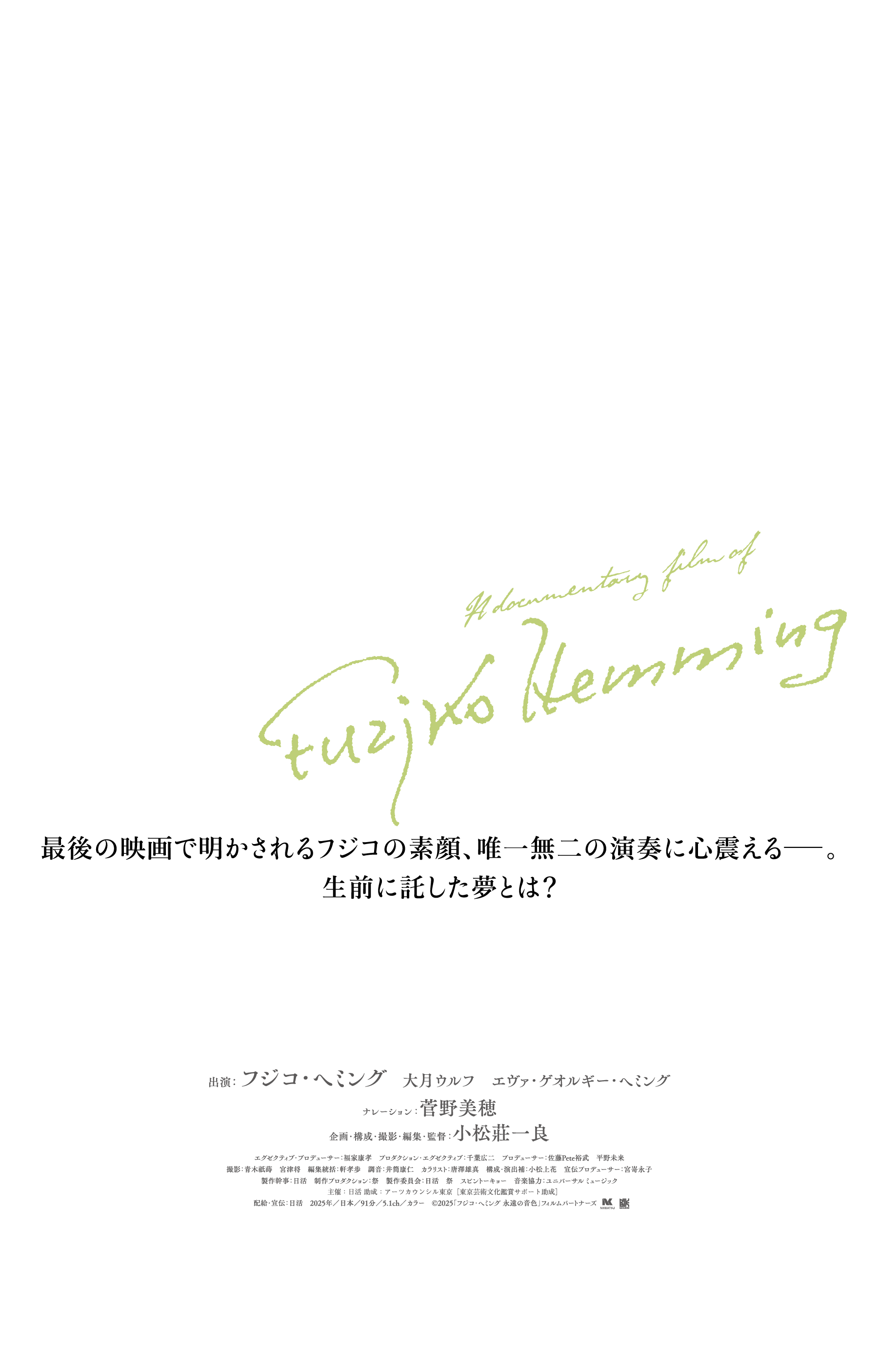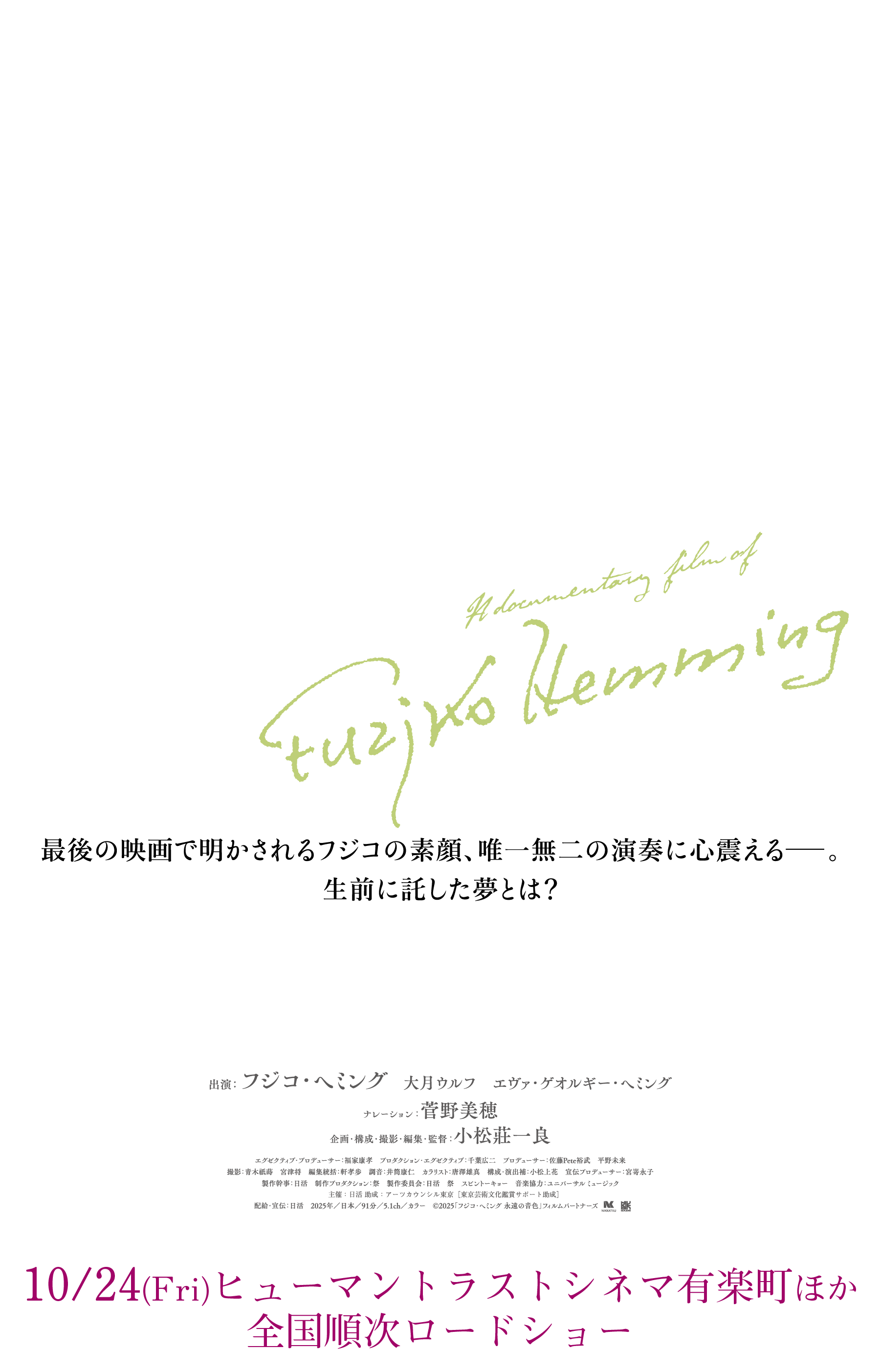 2024年4月21日に92歳で旅立ったフジコ・ヘミング。情感あふれるダイナミックな演奏は、音楽ファン以外でも国内外多くの人の心をとらえ、“魂のピアニスト”と呼ばれていた。その唯一無二の演奏を再び聴きたい、聴いてみたかったという熱い声が高まっている。本作では、圧巻の“ラ・カンパネラ”、名曲クラシックの数々、現代作曲家のオリジナル曲など初公開を含むフジコの演奏を映画館のスクリーンで最大限に体感できる。